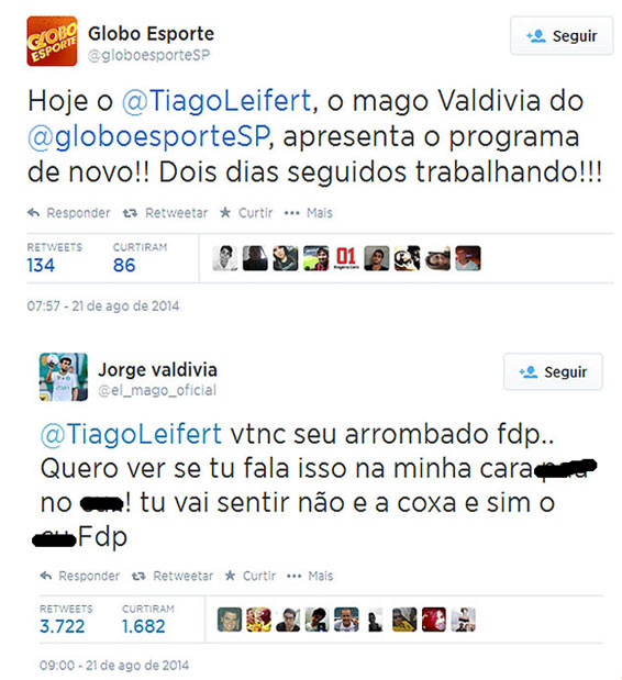 A primeira brincadeira partiu do Twitter do Globo Esporte que ironizou Tiago. Ele usou o Twitter para responder com muitos xingamentos ao apresentador Tiago Leifert da Rede Globo. Sou fã do Valdivia desde que ele xingou o Thiago Leifert.